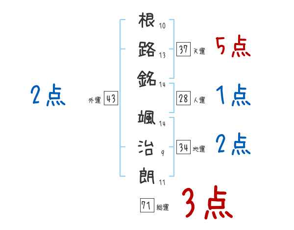 総運![]() | 根路銘颯治朗さんの総運は71画の3つ星!力が弱く小心者だが、いずれ安泰を手に入れる。 あなたの人生を表す1番重要な運勢です。生涯を通じて影響する総合運となり、主に50歳以降の晩年期に影響を及ぼします。 |