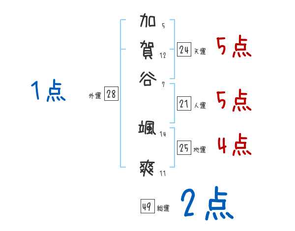 天運![]() | 加賀谷颯爽さんの天運は24画の5つ星!家庭運が良く順調な人生。金運にも恵まれる。 家系が持つ宿命的な運勢を表します。祖先から受け継いだ苗字ですので自分の力が及びません。家柄を象徴します。 |