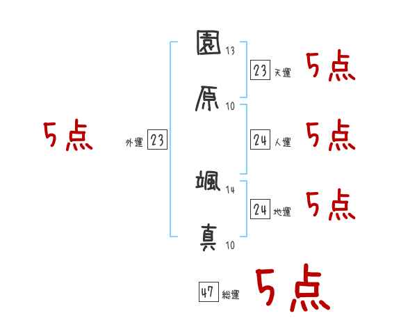 人運![]() | 園原颯真さんの人運は24画の5つ星!家庭運が良く順調な人生。金運にも恵まれる。 性格や才能などを表す2番目に重要な運勢です。人間関係や協調性、社会的な成功に影響します。主に20歳から50歳ぐらいまでの中年期の運勢を表します。 |