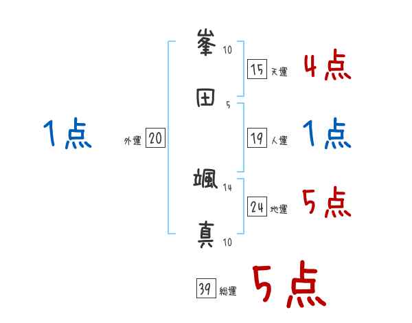 総運![]() | 峯田颯真さんの総運は39画の5つ星!社交性に優れ人望が厚い。人の上に立ち成功する。 あなたの人生を表す1番重要な運勢です。生涯を通じて影響する総合運となり、主に50歳以降の晩年期に影響を及ぼします。 |