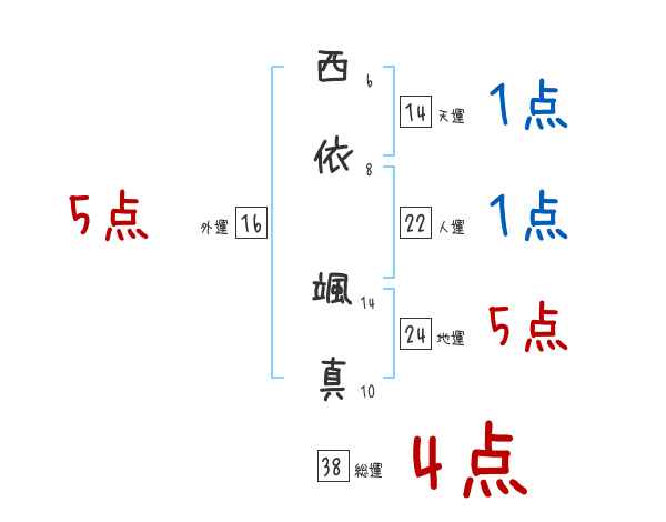 天運![]() | 西依颯真さんの天運は14画の1つ星!人に対して優しいがストレスを溜め込みがち。人間関係のトラブルを避けるよう気をつけましょう。 家系が持つ宿命的な運勢を表します。祖先から受け継いだ苗字ですので自分の力が及びません。家柄を象徴します。 |