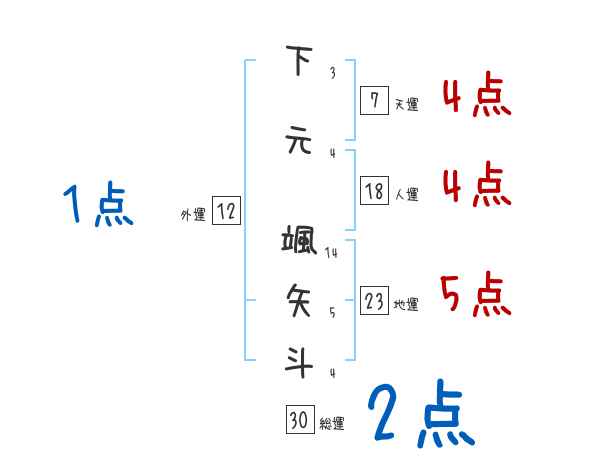 天運![]() | 下元颯矢斗さんの天運は7画の4つ星!強い意志や信念を持ち独立心が強い。自立する。 家系が持つ宿命的な運勢を表します。祖先から受け継いだ苗字ですので自分の力が及びません。家柄を象徴します。 |