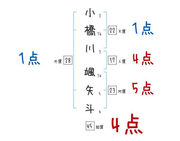 外運![]() | 小橋川颯矢斗さんの外運は28画の1つ星!家庭環境に注意。スポーツで活躍できる能力があるかも。 生活面を象徴する運勢です。外部から受ける影響力を表し、結婚運、家庭運や職場、環境への順応性を表します。 |