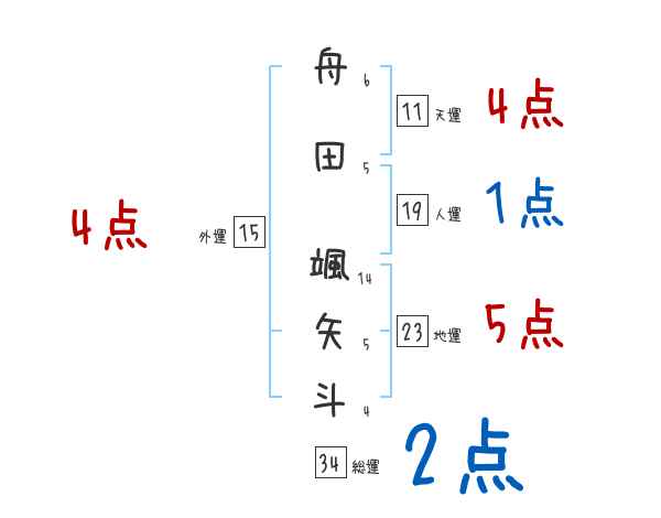 天運![]() | 舟田颯矢斗さんの天運は11画の4つ星!着実に富や地位を得る幸運な人生。 家系が持つ宿命的な運勢を表します。祖先から受け継いだ苗字ですので自分の力が及びません。家柄を象徴します。 |