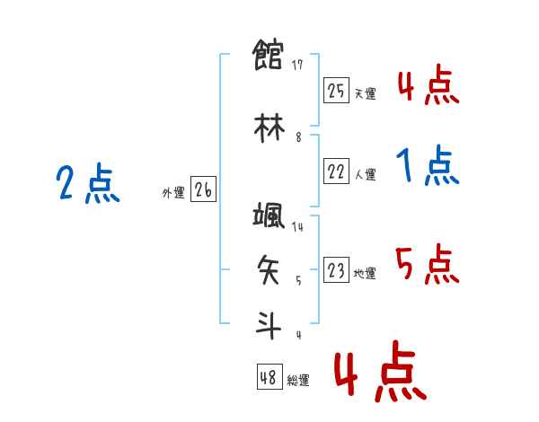 外運![]() | 館林颯矢斗さんの外運は26画の2つ星!波瀾万丈かも。信頼できる人を大事にしましょう。 生活面を象徴する運勢です。外部から受ける影響力を表し、結婚運、家庭運や職場、環境への順応性を表します。 |