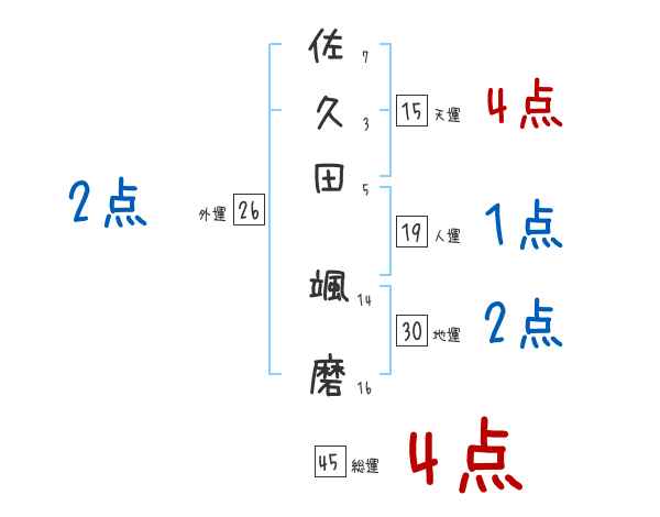 | 天運  | 佐久田颯磨さんの天運は15画の4つ星!人徳があり出世する。順調に物事を進め円満な人生。家系が持つ宿命的な運勢を表します。祖先から受け継いだ苗字ですので自分の力が及びません。家柄を象徴します。 |