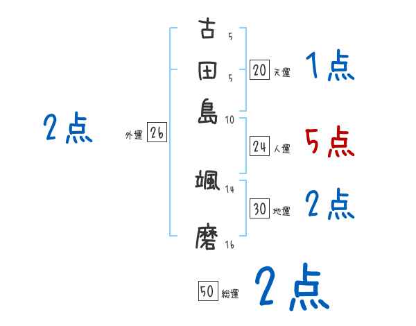 外運![]() | 古田島颯磨さんの外運は26画の2つ星!波瀾万丈かも。信頼できる人を大事にしましょう。 生活面を象徴する運勢です。外部から受ける影響力を表し、結婚運、家庭運や職場、環境への順応性を表します。 |