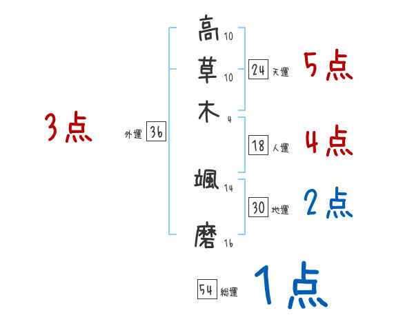 外運![]() | 高草木颯磨さんの外運は36画の3つ星!先見性が豊かです。多少神経質で苦労することも。 生活面を象徴する運勢です。外部から受ける影響力を表し、結婚運、家庭運や職場、環境への順応性を表します。 |