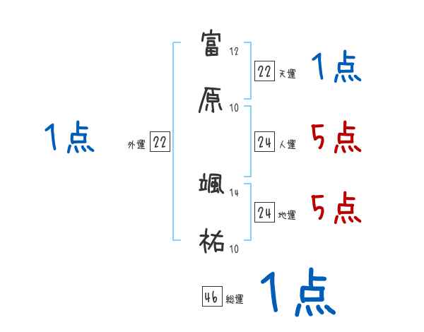 天運![]() | 富原颯祐さんの天運は22画の1つ星!努力することが苦手ないっぽう手先が器用。芸術性にも優れる。 家系が持つ宿命的な運勢を表します。祖先から受け継いだ苗字ですので自分の力が及びません。家柄を象徴します。 |