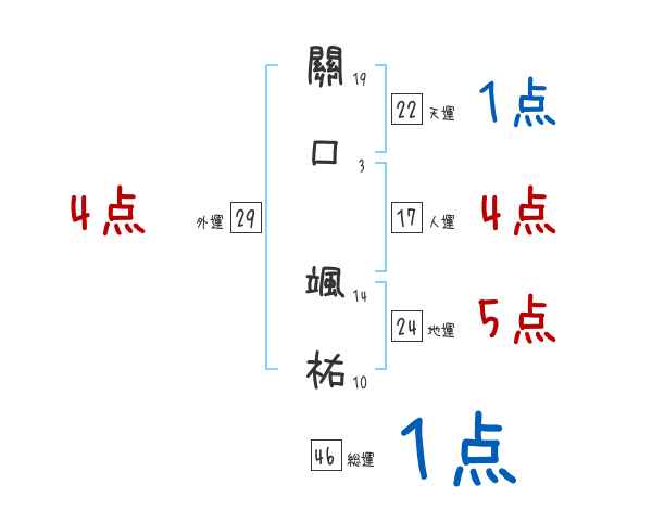 外運![]() | 關口颯祐さんの外運は29画の4つ星!完全主義で才能がある。厳格な心の持ち主。 生活面を象徴する運勢です。外部から受ける影響力を表し、結婚運、家庭運や職場、環境への順応性を表します。 |