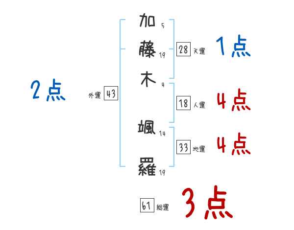 外運![]() | 加藤木颯羅さんの外運は43画の2つ星!頑固な性格で独立心が強いかも。やや非現実的で浪費に注意しましょう。 生活面を象徴する運勢です。外部から受ける影響力を表し、結婚運、家庭運や職場、環境への順応性を表します。 |