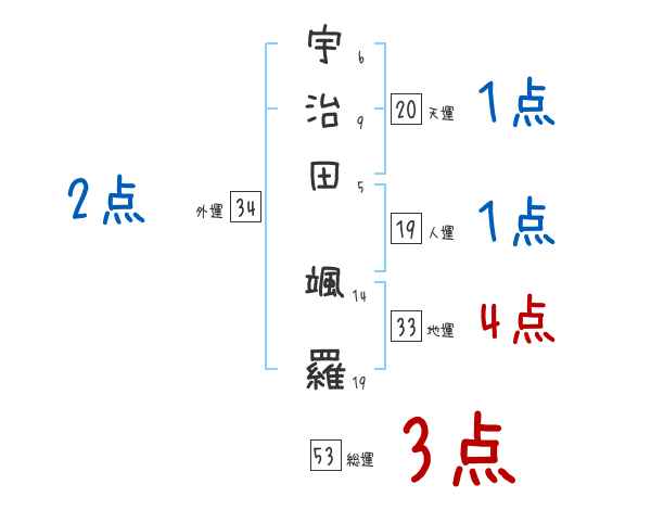 外運![]() | 宇治田颯羅さんの外運は34画の2つ星!独創性に優れるが、自尊心が強く災難に注意しましょう。 生活面を象徴する運勢です。外部から受ける影響力を表し、結婚運、家庭運や職場、環境への順応性を表します。 |