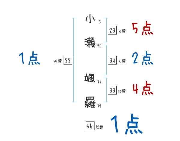 総運![]() | 小瀬颯羅さんの総運は56画の1つ星!消極的で無気力になりがち。誠実な気持ちが必要でしょう。 あなたの人生を表す1番重要な運勢です。生涯を通じて影響する総合運となり、主に50歳以降の晩年期に影響を及ぼします。 |