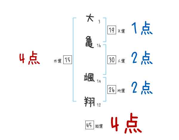外運![]() | 大亀颯翔さんの外運は15画の4つ星!人徳があり出世する。順調に物事を進め円満な人生。 生活面を象徴する運勢です。外部から受ける影響力を表し、結婚運、家庭運や職場、環境への順応性を表します。 |