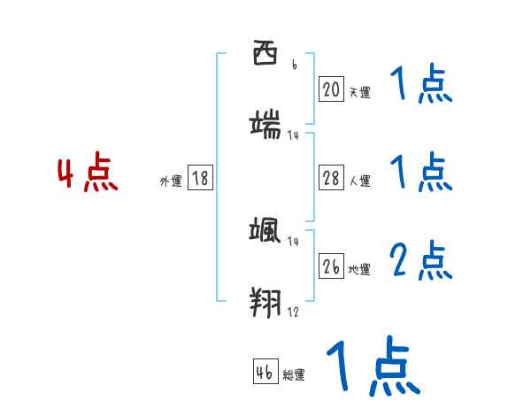 総運![]() | 西端颯翔さんの総運は46画の1つ星!迷走することが多く苦労するかも。目先のことにとらわれないように。 あなたの人生を表す1番重要な運勢です。生涯を通じて影響する総合運となり、主に50歳以降の晩年期に影響を及ぼします。 |