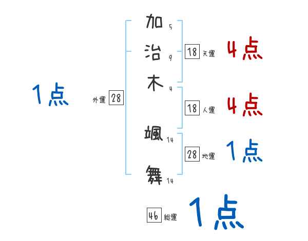 天運![]() | 加治木颯舞さんの天運は18画の4つ星!情熱的で剛気。忍耐力があり信頼される。 家系が持つ宿命的な運勢を表します。祖先から受け継いだ苗字ですので自分の力が及びません。家柄を象徴します。 |