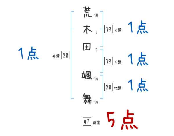 外運![]() | 荒木田颯舞さんの外運は28画の1つ星!家庭環境に注意。スポーツで活躍できる能力があるかも。 生活面を象徴する運勢です。外部から受ける影響力を表し、結婚運、家庭運や職場、環境への順応性を表します。 |