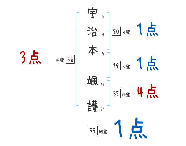 外運![]() | 宇治本颯護さんの外運は36画の3つ星!先見性が豊かです。多少神経質で苦労することも。 生活面を象徴する運勢です。外部から受ける影響力を表し、結婚運、家庭運や職場、環境への順応性を表します。 |