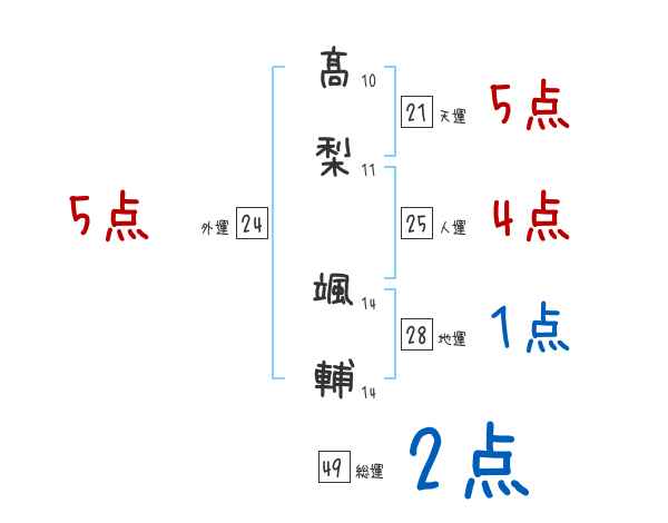 天運![]() | 髙梨颯輔さんの天運は21画の5つ星!統率力がある。独立し成功する。名誉を手に入れる。 家系が持つ宿命的な運勢を表します。祖先から受け継いだ苗字ですので自分の力が及びません。家柄を象徴します。 |