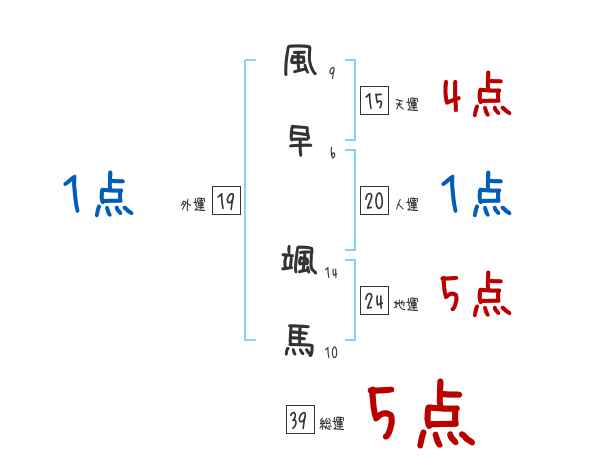 外運![]() | 風早颯馬さんの外運は19画の1つ星!優れた才能を持ちますが、協調性が足りないことも。周りの人と協力する事を意識しましょう。 生活面を象徴する運勢です。外部から受ける影響力を表し、結婚運、家庭運や職場、環境への順応性を表します。 |