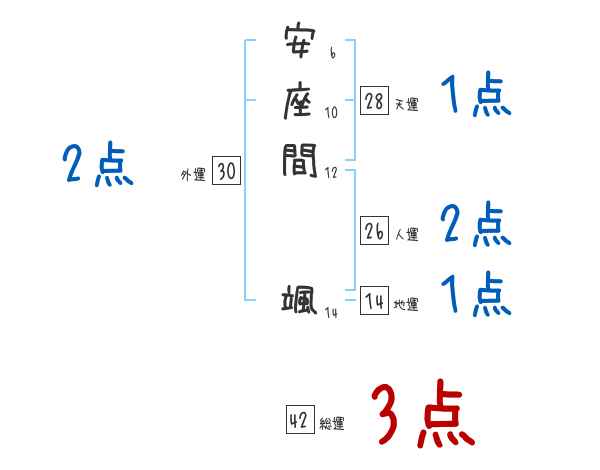 天運![]() | 安座間颯さんの天運は28画の1つ星!家庭環境に注意。スポーツで活躍できる能力があるかも。 家系が持つ宿命的な運勢を表します。祖先から受け継いだ苗字ですので自分の力が及びません。家柄を象徴します。 |