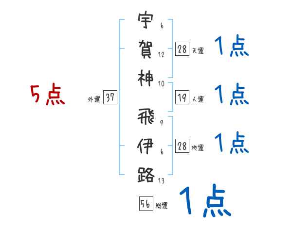 総運![]() | 宇賀神飛伊路さんの総運は56画の1つ星!消極的で無気力になりがち。誠実な気持ちが必要でしょう。 あなたの人生を表す1番重要な運勢です。生涯を通じて影響する総合運となり、主に50歳以降の晩年期に影響を及ぼします。 |