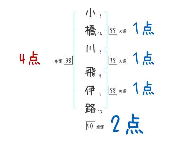 天運![]() | 小橋川飛伊路さんの天運は22画の1つ星!努力することが苦手ないっぽう手先が器用。芸術性にも優れる。 家系が持つ宿命的な運勢を表します。祖先から受け継いだ苗字ですので自分の力が及びません。家柄を象徴します。 |