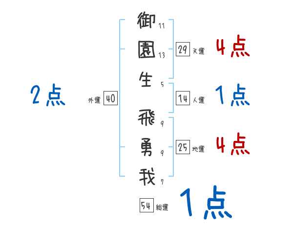 総運![]() | 御園生飛勇我さんの総運は54画の1つ星!トラブルが多いかも。周りをよく見て協調して過ごしましょう。 あなたの人生を表す1番重要な運勢です。生涯を通じて影響する総合運となり、主に50歳以降の晩年期に影響を及ぼします。 |