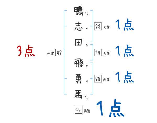 天運![]() | 鴨志田飛勇馬さんの天運は28画の1つ星!家庭環境に注意。スポーツで活躍できる能力があるかも。 家系が持つ宿命的な運勢を表します。祖先から受け継いだ苗字ですので自分の力が及びません。家柄を象徴します。 |