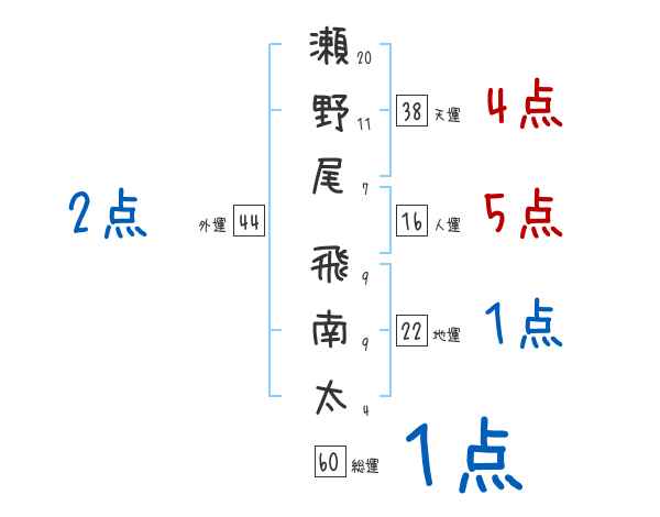 外運![]() | 瀬野尾飛南太さんの外運は44画の2つ星!誠実で慎重な性格。物事を考えすぎないように注意しましょう。 生活面を象徴する運勢です。外部から受ける影響力を表し、結婚運、家庭運や職場、環境への順応性を表します。 |