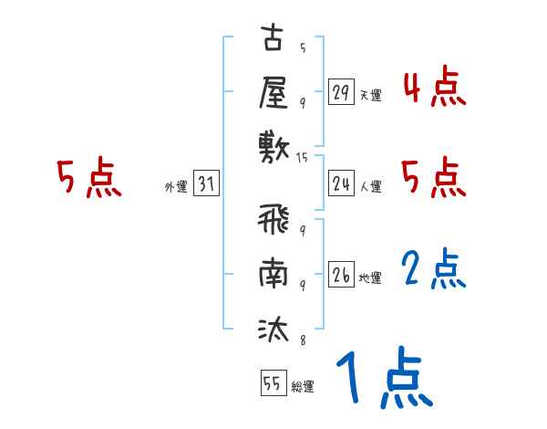 天運![]() | 古屋敷飛南汰さんの天運は29画の4つ星!完全主義で才能がある。厳格な心の持ち主。 家系が持つ宿命的な運勢を表します。祖先から受け継いだ苗字ですので自分の力が及びません。家柄を象徴します。 |