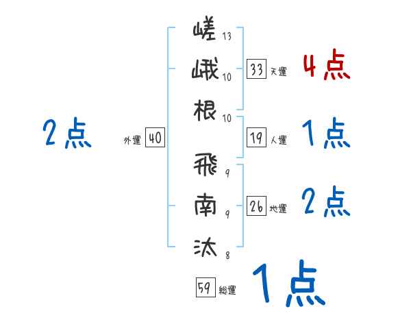 地運![]() | 嵯峨根飛南汰さんの地運は26画の2つ星!波瀾万丈かも。信頼できる人を大事にしましょう。 個性を表す基礎的な運勢です。性格形成や対人関係、行動力など家庭環境に影響されます。主に誕生してから20歳くらいまでの若年期の運勢を表します。 |