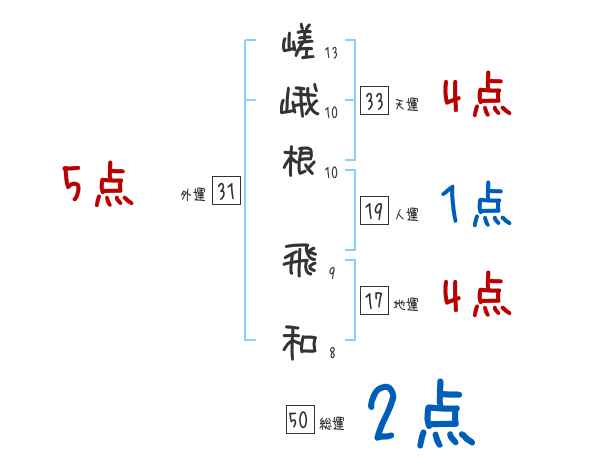 人運![]() | 嵯峨根飛和さんの人運は19画の1つ星!優れた才能を持ちますが、協調性が足りないことも。周りの人と協力する事を意識しましょう。 性格や才能などを表す2番目に重要な運勢です。人間関係や協調性、社会的な成功に影響します。主に20歳から50歳ぐらいまでの中年期の運勢を表します。 |