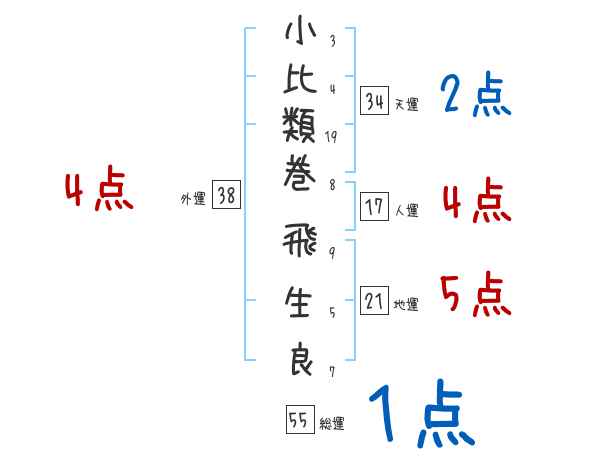 人運![]() | 小比類巻飛生良さんの人運は17画の4つ星!積極的な行動力。地位を気づき財産を手に入れる。純粋な心と直感力。 性格や才能などを表す2番目に重要な運勢です。人間関係や協調性、社会的な成功に影響します。主に20歳から50歳ぐらいまでの中年期の運勢を表します。 |