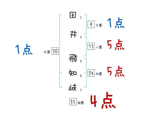 天運![]() | 田井飛知岐さんの天運は9画の1つ星!消極的で才能を発揮することが苦手なことも。周りの意見に耳を傾けましょう。 家系が持つ宿命的な運勢を表します。祖先から受け継いだ苗字ですので自分の力が及びません。家柄を象徴します。 |