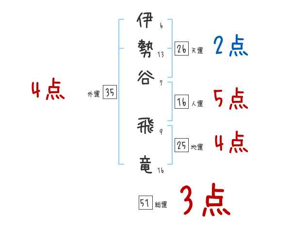 天運![]() | 伊勢谷飛竜さんの天運は26画の2つ星!波瀾万丈かも。信頼できる人を大事にしましょう。 家系が持つ宿命的な運勢を表します。祖先から受け継いだ苗字ですので自分の力が及びません。家柄を象徴します。 |