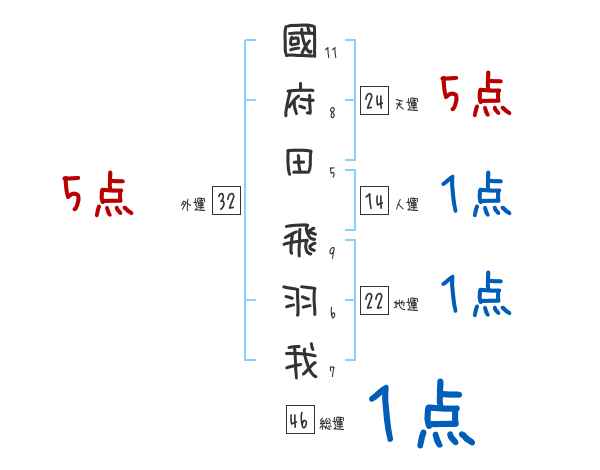 外運![]() | 國府田飛羽我さんの外運は32画の5つ星!柔軟性があり成功する。チャンスが多く金運が良い。 生活面を象徴する運勢です。外部から受ける影響力を表し、結婚運、家庭運や職場、環境への順応性を表します。 |