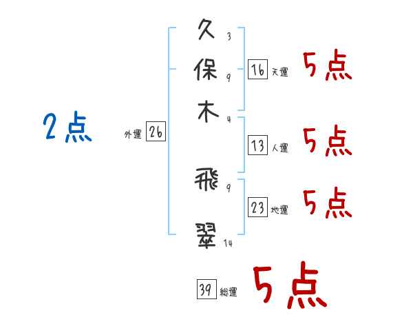総運![]() | 久保木飛翠さんの総運は39画の5つ星!社交性に優れ人望が厚い。人の上に立ち成功する。 あなたの人生を表す1番重要な運勢です。生涯を通じて影響する総合運となり、主に50歳以降の晩年期に影響を及ぼします。 |