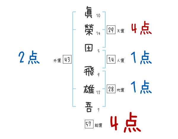 総運![]() | 眞榮田飛雄吾さんの総運は57画の4つ星!向上心があり人望がある。地位を得る。 あなたの人生を表す1番重要な運勢です。生涯を通じて影響する総合運となり、主に50歳以降の晩年期に影響を及ぼします。 |