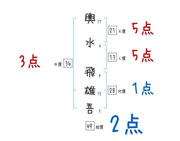 外運![]() | 輿水飛雄吾さんの外運は36画の3つ星!先見性が豊かです。多少神経質で苦労することも。 生活面を象徴する運勢です。外部から受ける影響力を表し、結婚運、家庭運や職場、環境への順応性を表します。 |
