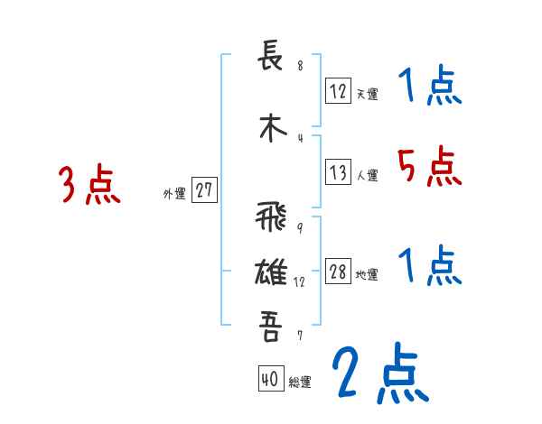 人運![]() | 長木飛雄吾さんの人運は13画の5つ星!才能に恵まれ人気がある。名声を手に入れる。円満な人生。 性格や才能などを表す2番目に重要な運勢です。人間関係や協調性、社会的な成功に影響します。主に20歳から50歳ぐらいまでの中年期の運勢を表します。 |