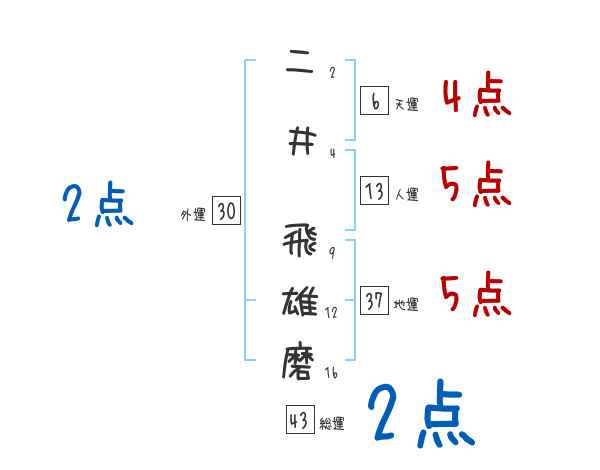 総運![]() | 二井飛雄磨さんの総運は43画の2つ星!頑固な性格で独立心が強いかも。やや非現実的で浪費に注意しましょう。 あなたの人生を表す1番重要な運勢です。生涯を通じて影響する総合運となり、主に50歳以降の晩年期に影響を及ぼします。 |