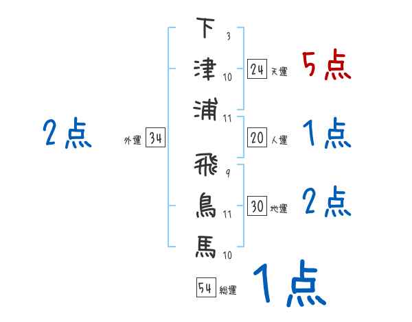 地運![]() | 下津浦飛鳥馬さんの地運は30画の2つ星!浮き沈みの激しさに注意しましょう。 個性を表す基礎的な運勢です。性格形成や対人関係、行動力など家庭環境に影響されます。主に誕生してから20歳くらいまでの若年期の運勢を表します。 |