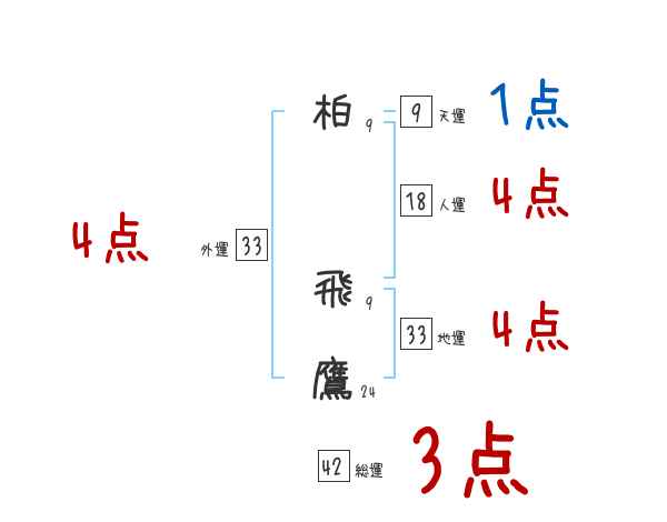 外運![]() | 柏飛鷹さんの外運は33画の4つ星!権力志向でプライドが高い。勇気があり運を切り開き成功する。 生活面を象徴する運勢です。外部から受ける影響力を表し、結婚運、家庭運や職場、環境への順応性を表します。 |