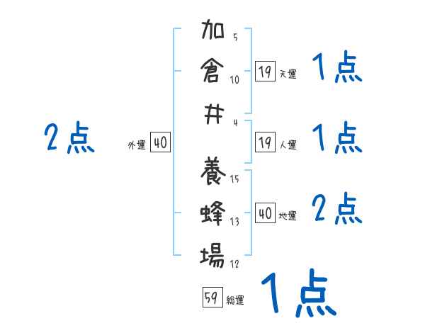 人運![]() | 加倉井養蜂場さんの人運は19画の1つ星!優れた才能を持ちますが、協調性が足りないことも。周りの人と協力する事を意識しましょう。 性格や才能などを表す2番目に重要な運勢です。人間関係や協調性、社会的な成功に影響します。主に20歳から50歳ぐらいまでの中年期の運勢を表します。 |