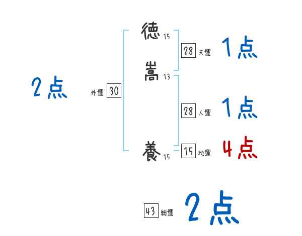 天運![]() | 徳嵩養さんの天運は28画の1つ星!家庭環境に注意。スポーツで活躍できる能力があるかも。 家系が持つ宿命的な運勢を表します。祖先から受け継いだ苗字ですので自分の力が及びません。家柄を象徴します。 |