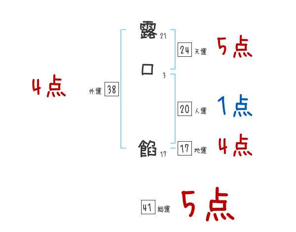 天運![]() | 露口餡さんの天運は24画の5つ星!家庭運が良く順調な人生。金運にも恵まれる。 家系が持つ宿命的な運勢を表します。祖先から受け継いだ苗字ですので自分の力が及びません。家柄を象徴します。 |