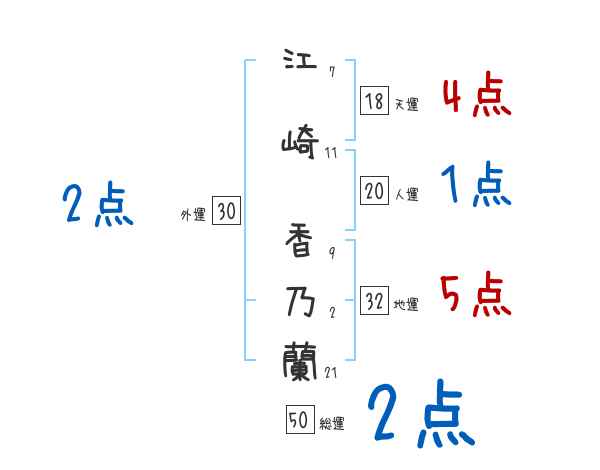 天運![]() | 江崎香乃蘭さんの天運は18画の4つ星!情熱的で剛気。忍耐力があり信頼される。 家系が持つ宿命的な運勢を表します。祖先から受け継いだ苗字ですので自分の力が及びません。家柄を象徴します。 |