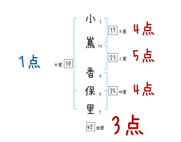 外運![]() | 小嶌香保里さんの外運は19画の1つ星!優れた才能を持ちますが、協調性が足りないことも。周りの人と協力する事を意識しましょう。 生活面を象徴する運勢です。外部から受ける影響力を表し、結婚運、家庭運や職場、環境への順応性を表します。 |