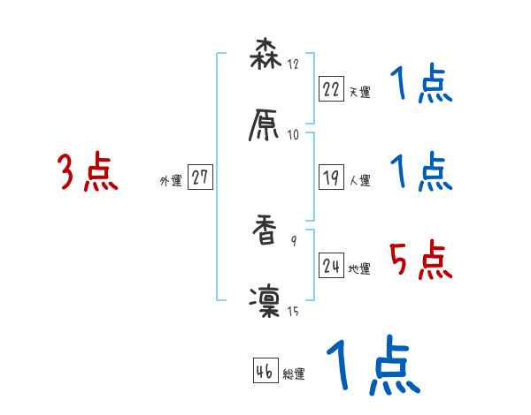総運![]() | 森原香凜さんの総運は46画の1つ星!迷走することが多く苦労するかも。目先のことにとらわれないように。 あなたの人生を表す1番重要な運勢です。生涯を通じて影響する総合運となり、主に50歳以降の晩年期に影響を及ぼします。 |